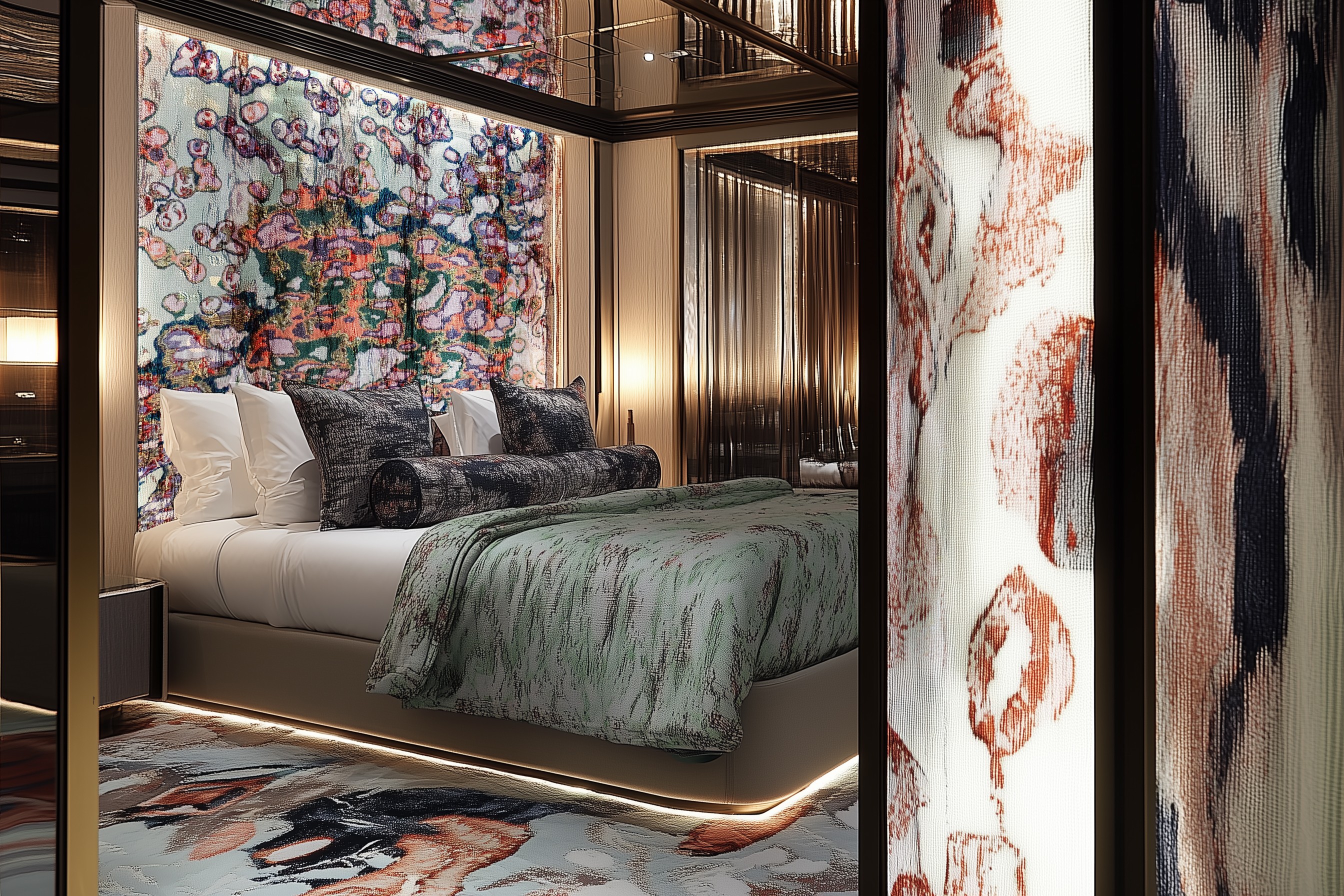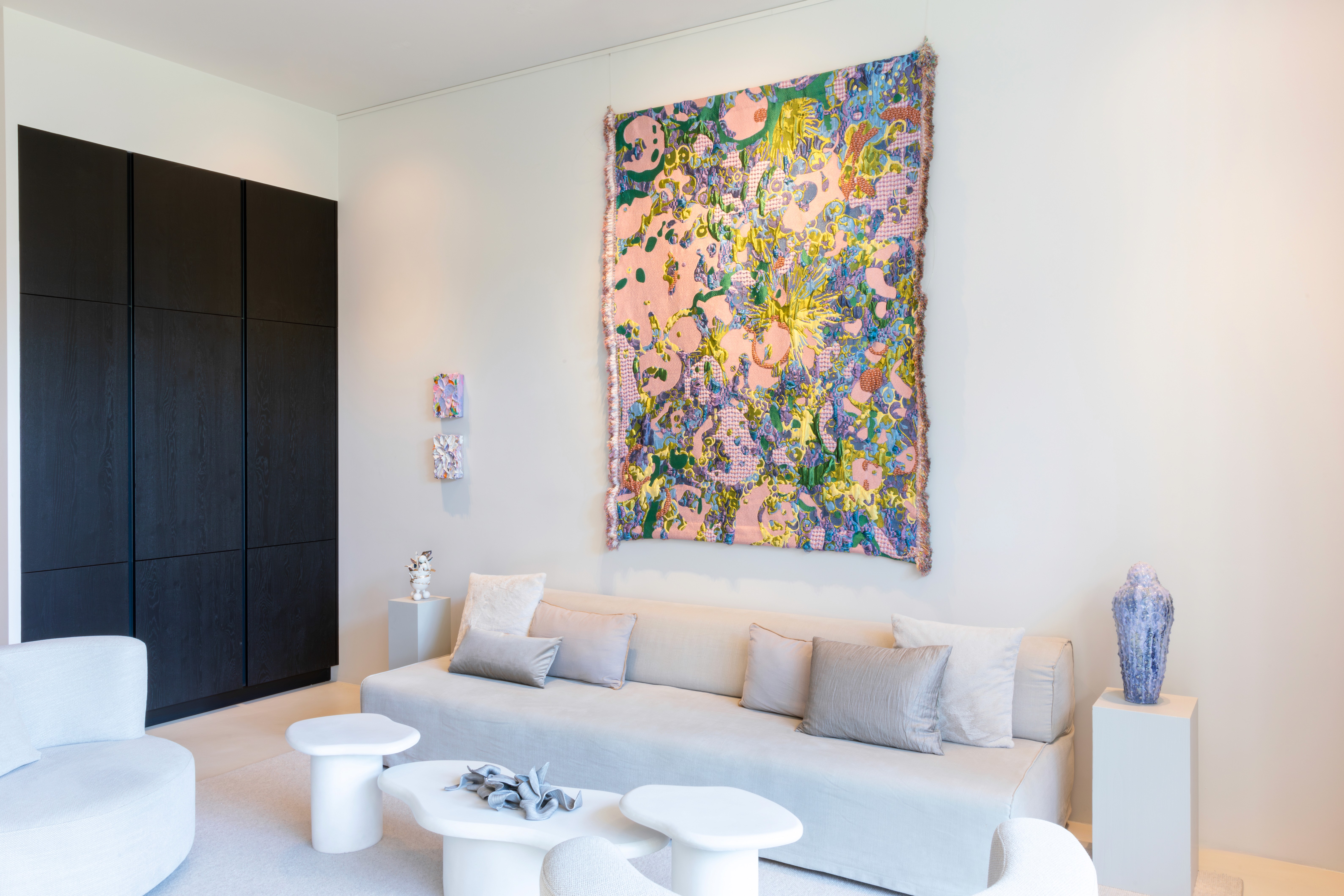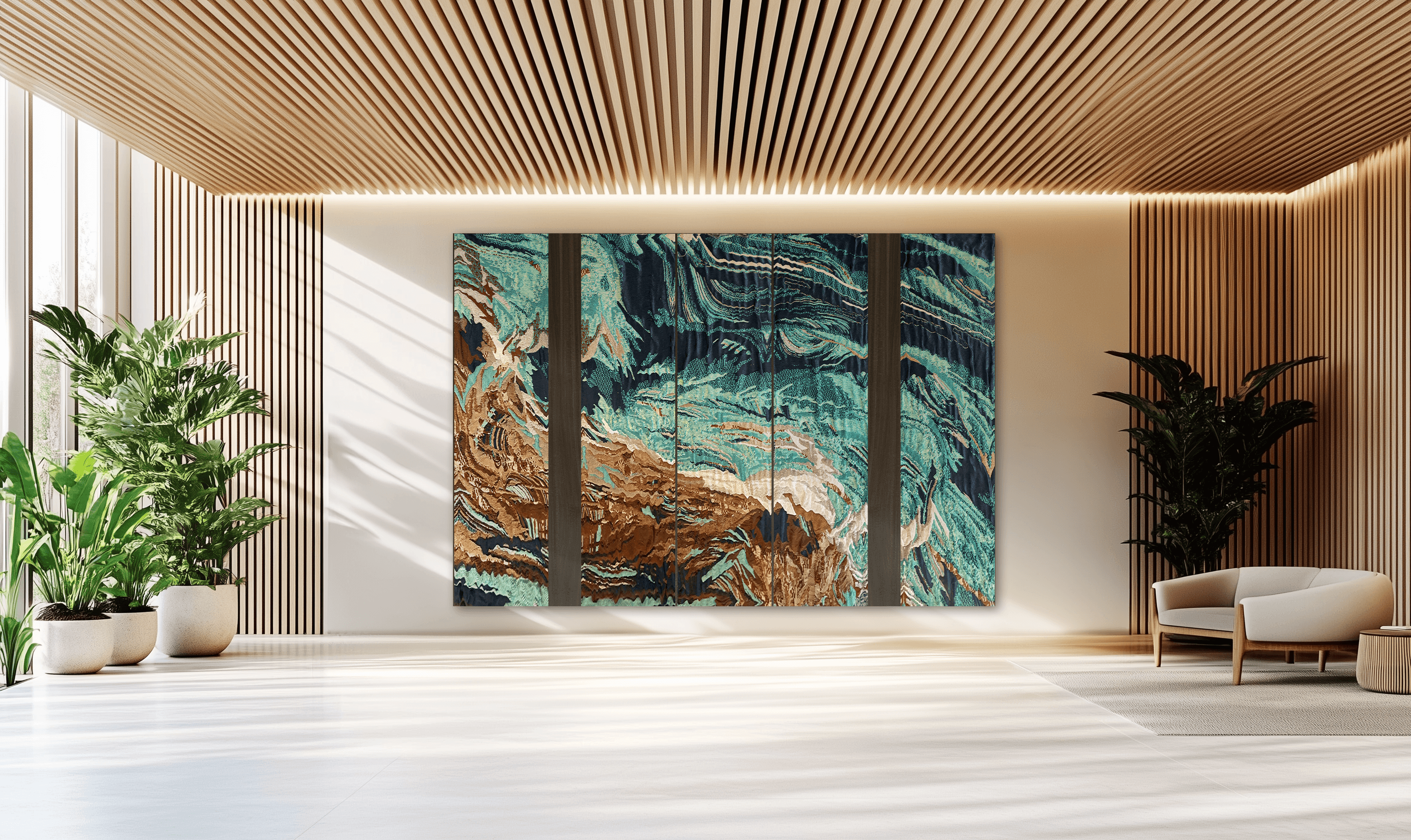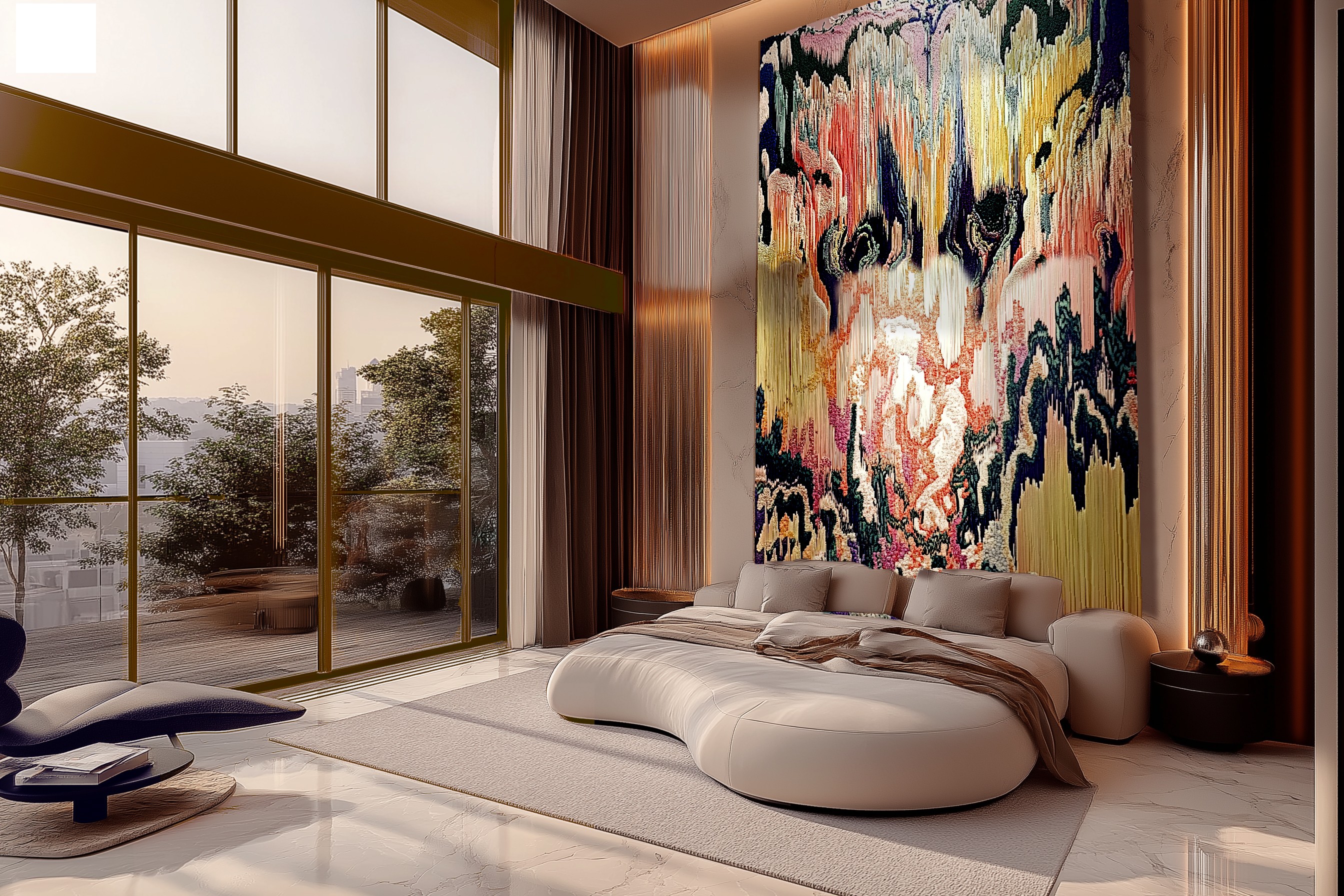 Many interiors are “finished” before art enters the room, but I work the other way around. Art can guide a space, adding warmth, creating depth, shifting energy, and inviting calm or movement. Especially with my high-end textile works, material, light, and texture interact throughout the day. Morning feels different from evening, sunlight reveals new layers, and subtle movements in texture invite touch and curiosity. By stimulating your senses—sight, touch, and even the acoustics of a room—my works create a fully immersive experience. You don’t just see the art; you feel it, and it transforms the way you live in the space.